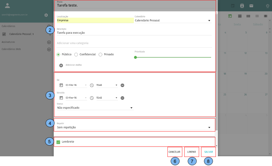 (2)Informações gerais sobre a tarefa (3)Informações sobre data, horário e duração da tarefa (4)Configuração sobre repetição da tarefa. (5)Configuração sobre lembretes da tarefa. (6)Botão para cancelar a criação da tarefa. (7)Caso seja necessário limpe todos os campos digitados. (8)Salvar a tarefa.