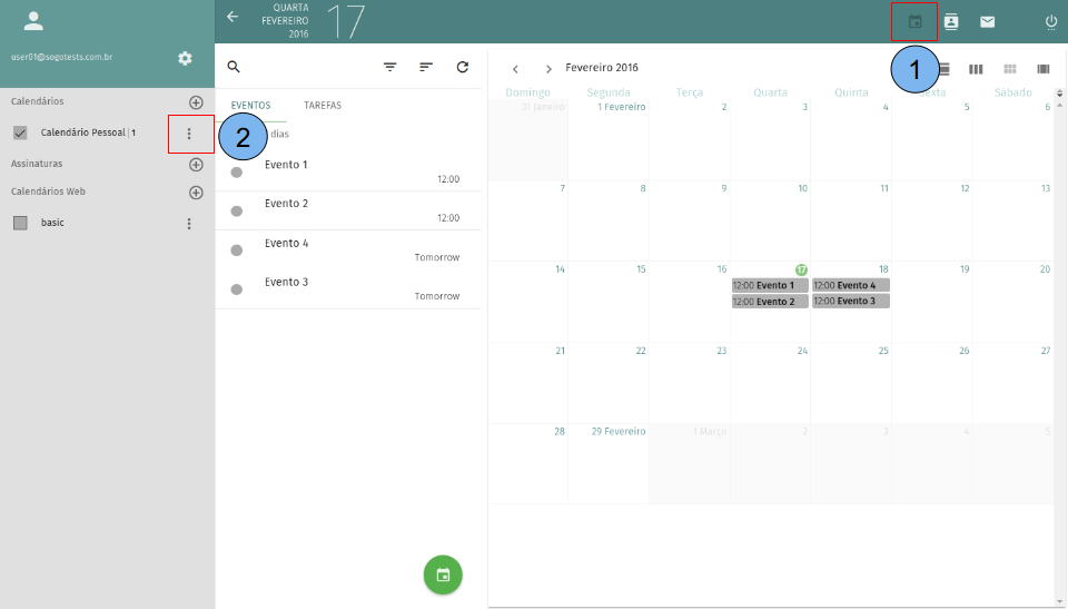 São as permissões especificas de acesso ao seu calendário que cada usuário do domínio terá. (1)Acesse Calendário. (2)Em seguida acesse o menu do calendário.
