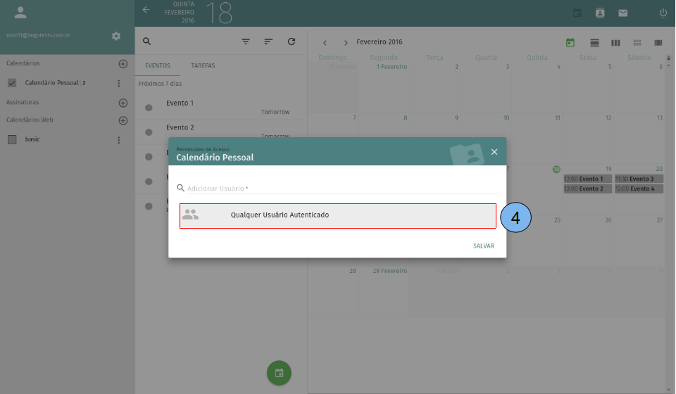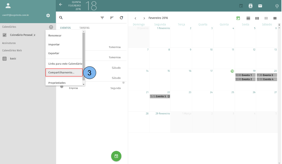 Na conta para onde o calendário foi compartilhado (8), veja que o calendário já aparece para o usuário (9), ao selecionar o calendário em questão é possível acessar os eventos e tarefas do mesmo (10).