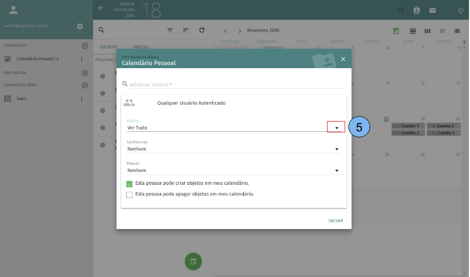 Após clicar em “Qualquer usuário Autenticado” defina as permissões padrão que os usuários terão sobre seus calendários. (5) Para alterar as permissões clique na seta indicada pelo número 5 na figura.