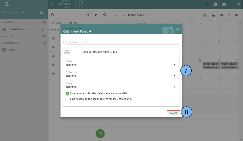 (7)Defina todas as permissões conforme a classificação dos compromissos da agenda. (8) Clique em “Salvar”.
