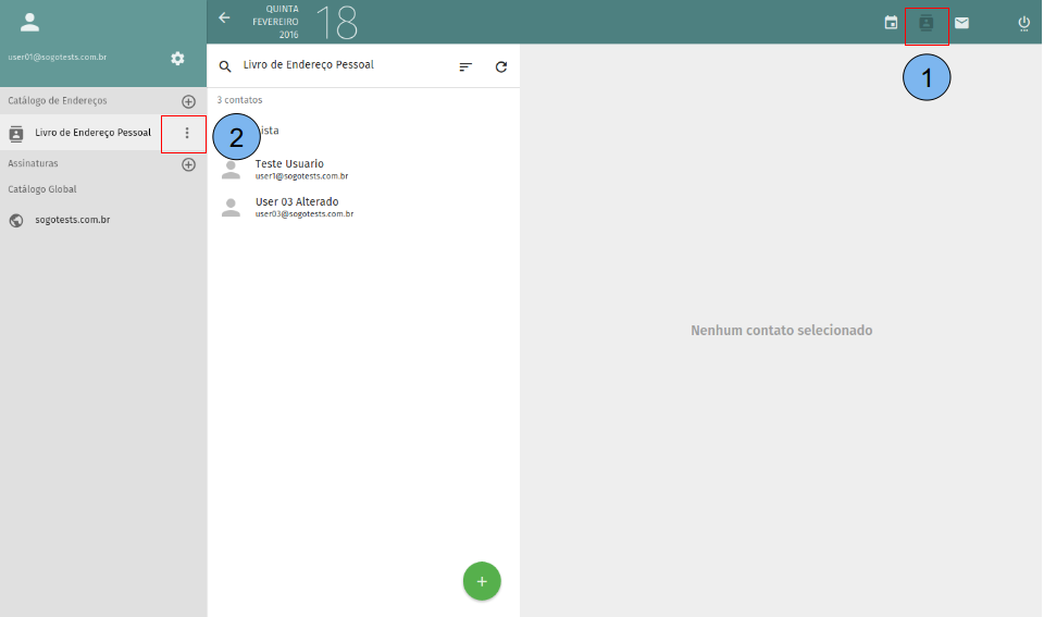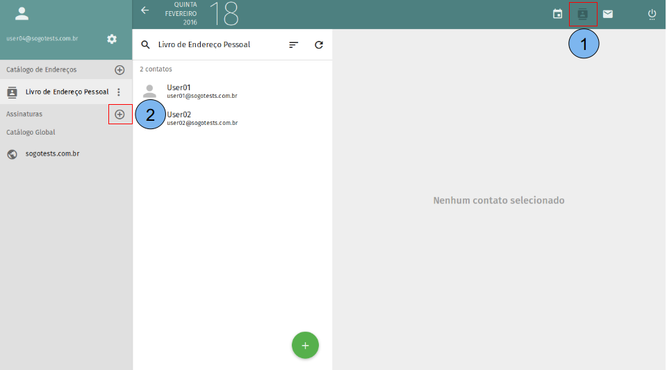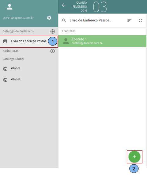(1)Selecione o catálogo onde o contato será criado. (2)Clique em adicionar no botão (+).