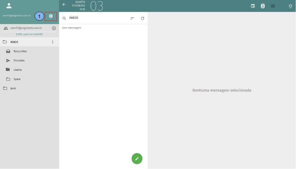 Na página inicial da tela de correio temos: (1)Relação de pastas da conta do usuário. (2)Lista de e-mails de uma pasta. (3)Corpo de um e-mail selecionado. (4)Escrever novo e-mail.