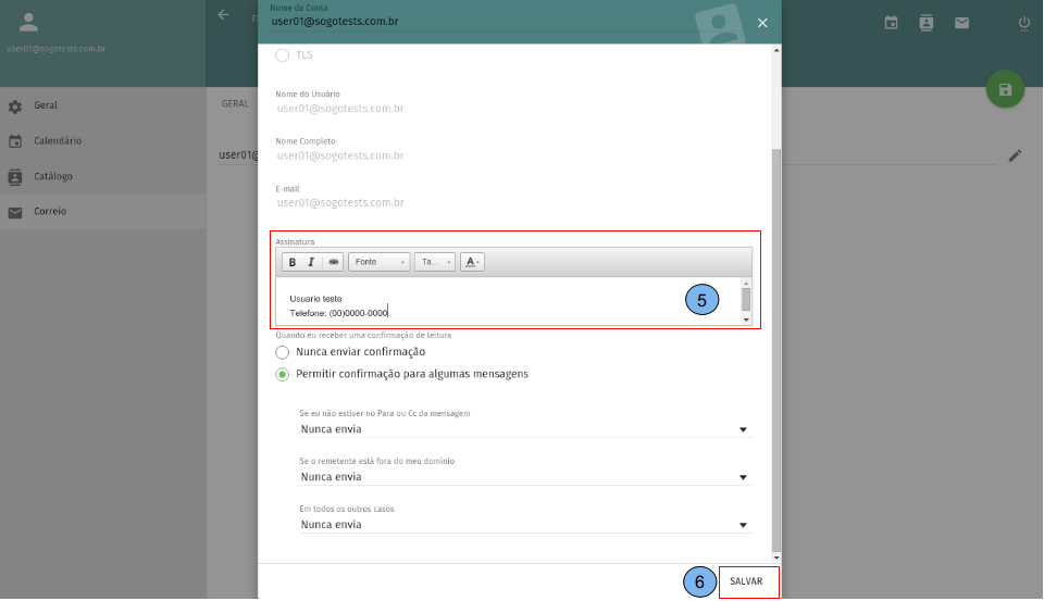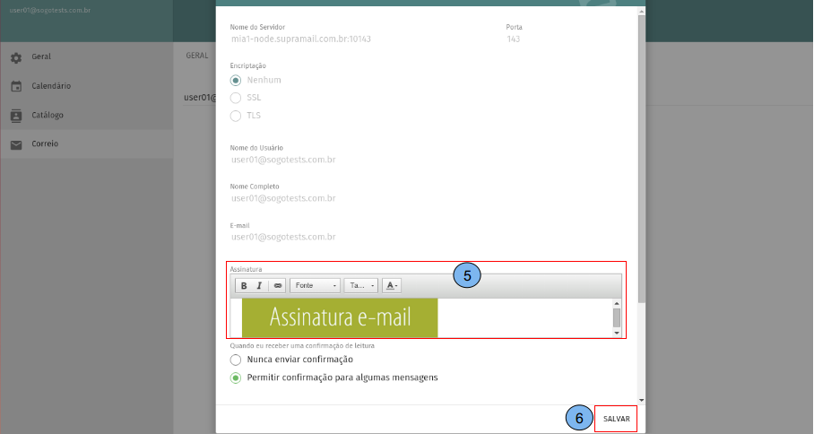 Em “Assinatura”(5) digite o texto da sua assinatura de e-mail. Clique em “Salvar”(6).