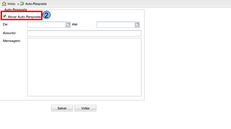 Nesta tela, para criar a auto resposta, marque a opção “Ativar Auto-Resposta” (2), assim as opções ficarão editáveis.