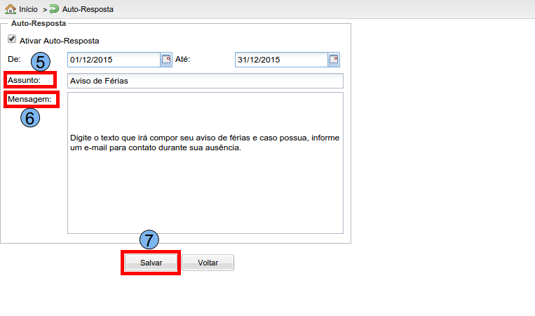 Após selecionar as datas de início e fim, no campo “Assunto” (5), informe qual será o assunto da auto resposta, exemplo “Aviso de Férias”, no campo “Mensagem” (6), informe o conteúdo que será enviado como auto resposta, após preencher os campos, basta clicar em “Salvar” (7) e sua auto resposta estará configurada.