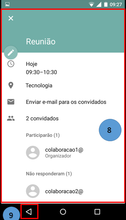 Após ter salvo as alterações o aplicativo mostrará a tela com os detalhes do evento assim como os seus convidados (8), clique em voltar (9) para ir para a tela inicial do aplicativo “Agenda” (9).