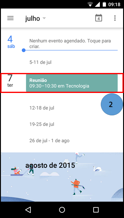 As telas abaixo mostram como criar eventos em dispositivos Android. Abra o aplicativo “Agenda” em seu dispositivo (1).