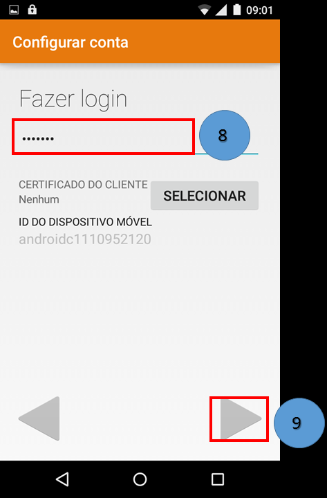 Na próxima tela insira a senha da conta (8) e em seguida clique em “PRÓXIMO”(9).