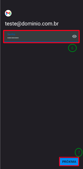 Insira a Senha (6) conta de email e clique em Próxima.(7)