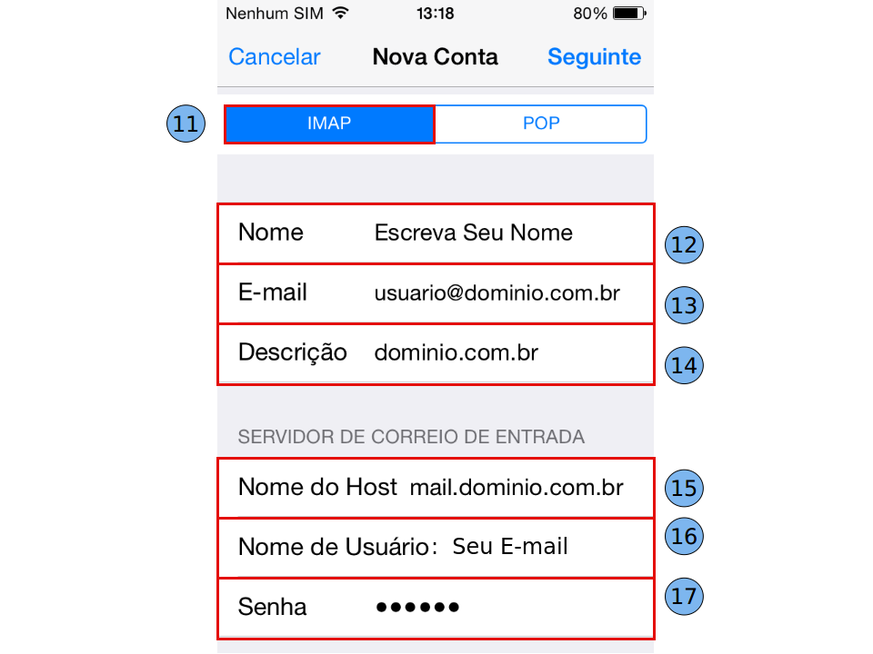 Agora preencha as informações de recebimento e de envio: Nome (12): digite seu nome Endereço (13): digite o endereço completo do seu e-mail. Descrição (14): digite seu e-mail ou a descrição que desejar. "Servidor de Correio de Entrada": Nome do Host (15): mail. dominio.com.br Nome de Usuário (16): digite seu e-mail. Senha (17): digite sua senha.