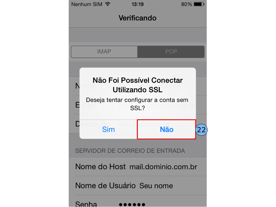 O iPhone pode levar alguns instantes para terminar as configurações. Caso apareça esta mensagem sobre SSL, escolha "Não" (22).