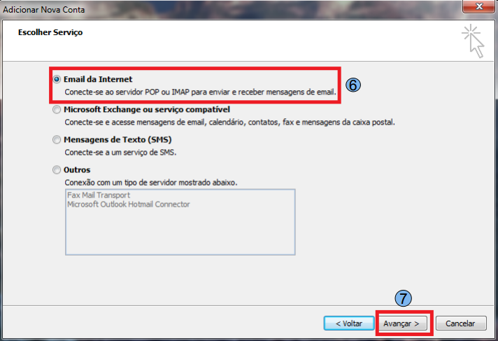 Clique em Email da internet (6) e em seguida Avançar (7).