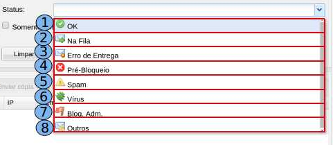 Status “Bloqueio Administrativo” (7) - Existe uma restrição no Filtro Antispam que ocasionou o bloqueio. Consulte o campo “Observação” na Auditoria para visualizar o motivo do bloqueio.