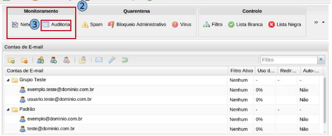 Na guia “Monitoramento” (2), clique em opção “Auditoria” (3).