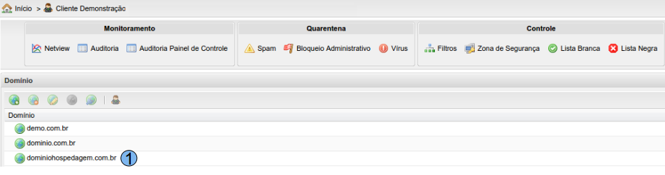 Acesse o Painel de Controle através do endereço: https://painel.provedor.com.br Acesse o domínio ao qual deseja manipular através de um clique duplo (1):