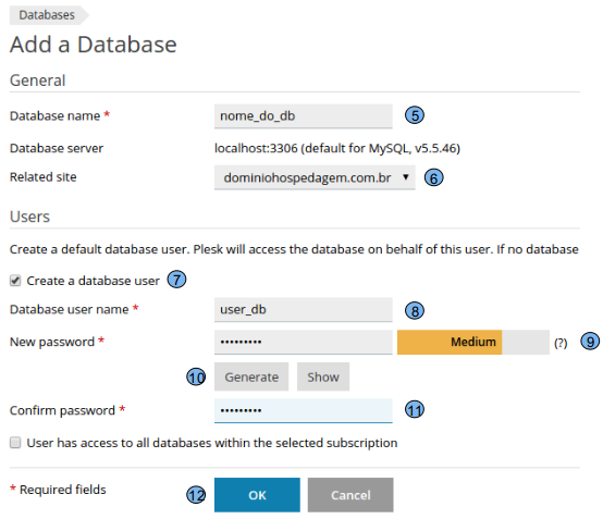 Em seguida clique na opção Add Database (4) Em seguida informe as opções referente ao banco de dados a ser criado: (5) Database name: informe o nome do banco de dados a ser criado (6) Related site: informe para qual site o banco de dados em questão será definido (7) Create a database user: marque essa opção para criar o usuário do banco de dados (8) Databse user name: defina o nome do usuário do banco de dados (9) New Password: Digite a senha do banco de dados (10) Generate: Utilize essa opção para gerar uma senha aleatória (11) Confirm password: Confirme a senha utilizada anteriormente (12) Ok: Utilize essa opção passar confirmar a criação
