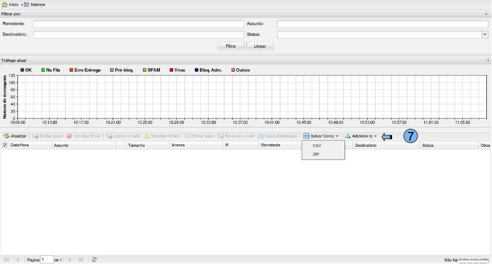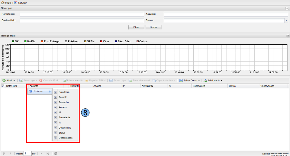Após carregar os e-mails filtrados, o netview disponibiliza algumas ações para os e-mails, veja na opção (7): Atualizar: Irá atualizar em tempo real a tela dos e-mails filtrados, caso alguma ação tenha sido realizada, por exemplo, liberar um e-mail que estava com status “Na Fila”. Enviar agora: Caso algum e-mail esteja preso com status “Na Fila”, clicando nesta opção, será feita uma nova tentativa de envio, se o servidor remoto estiver disponível o e-mail será enviado e seu status mudará para “OK”. Cancelar Envio: Caso algum e-mail esteja com status “Na Fila”, clicando nesta opção, o e-mail em questão terá seu envio cancelado. Liberar e-mails: Caso algum e-mail chegue com status Spam ou algum tipo de bloqueio administrativo, nesta opção é possível liberá-lo para a caixa postal do usuário. Reportar Spam: Se algum e-mail não válido chegar com status “Ok”, clicando nesta opção, o e-mail será denunciado como Spam. Enviar Cópia: Envia uma cópia do e-mail selecionado para outro e-mail. Reenviar e-mail: Reenvia o e-mail para o destinatário. Cópia Autenticada: Retira uma cópia autenticada do e-mail. Salvar Como: Os e-mails podem ser salvos nos formatos ZIP e CVS. Adicionar a: Adiciona uma conta de e-mail à lista de remetentes confiáveis do usuário.